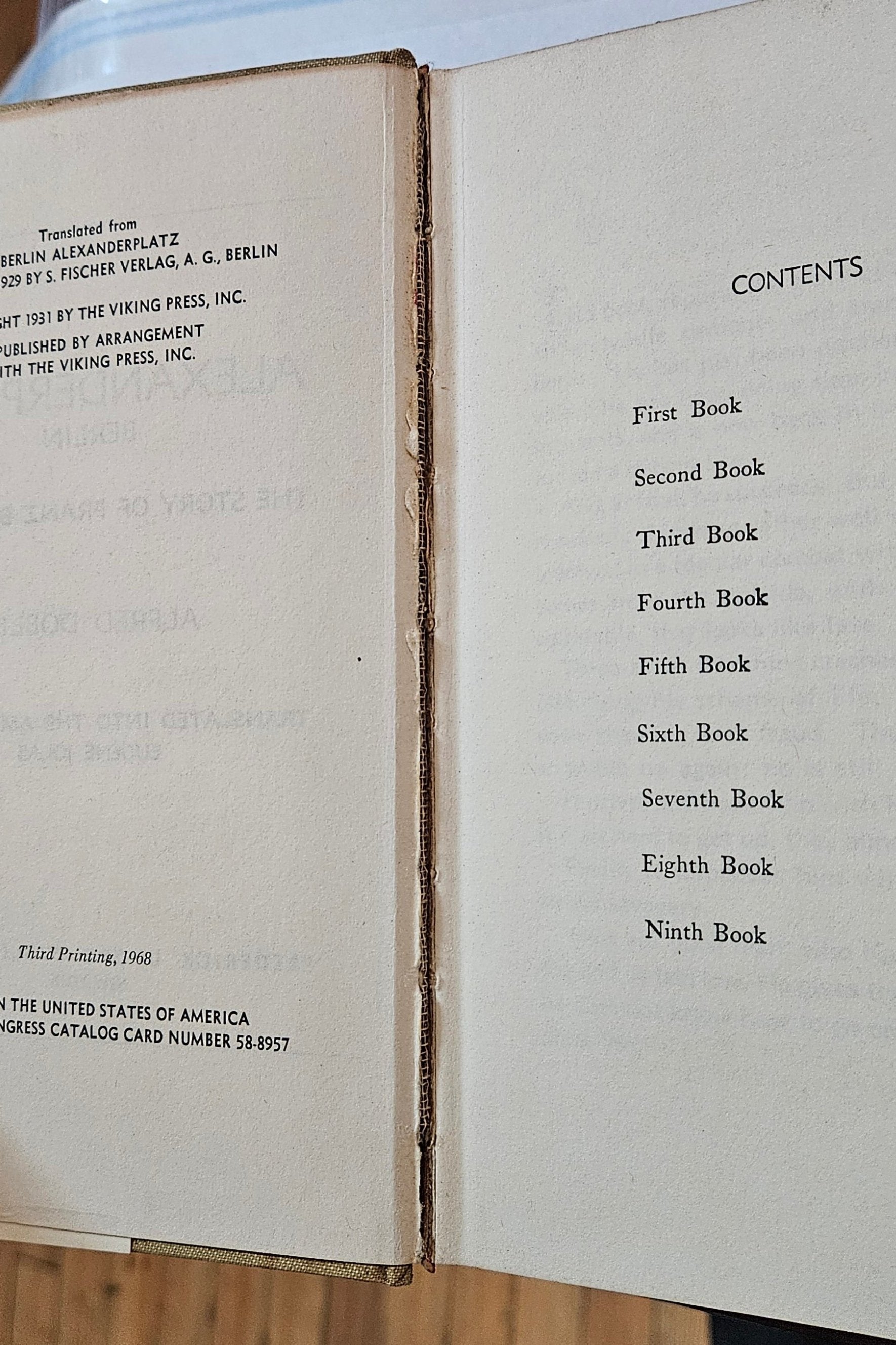 3rd printing, Viking Press / Frederick Ungar Publishing, 1968. Unclipped DJ with tear at bottom (pictured), rubbing, soiling & general age to front & back cover; orange block at spine titling is faded, though author's name is still very much visible, as is "Alexanderplatz." Some separation at front hinge (pictured), but no loose pages and, aside from this weak point, the binding is still firm; cream cloth boards show foxing but spine lettering is still bright, top-edge also has foxing, fore-edge with some scuffing. A nice copy of an important Modernist work, scarce in hardcover and priced according to its flaws.
