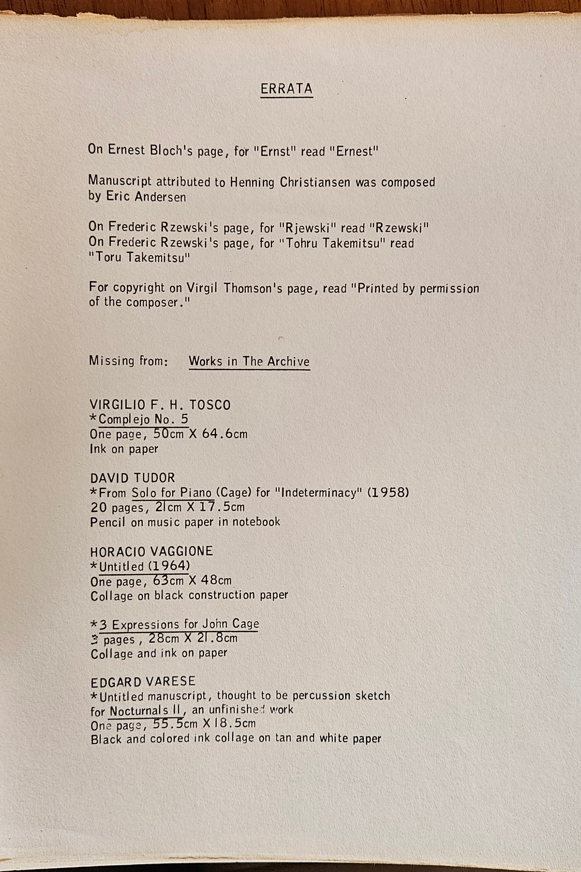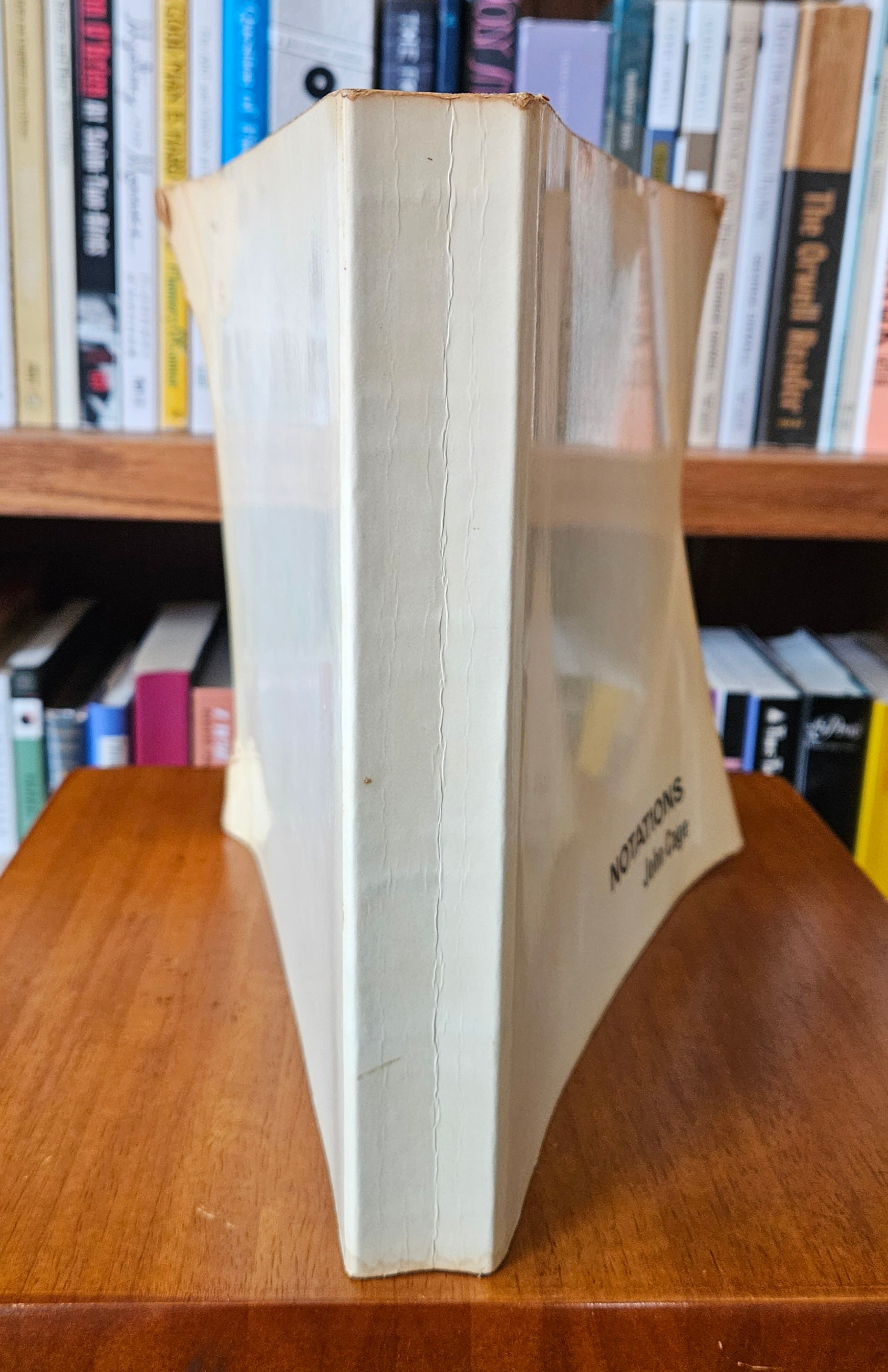 1st printing, Something Else Press. White wraps rubbed & age-toned, tanning present to both front & back, curling & wrinkling at edges (common in these paperback printings), spine faded with a crease that does not effect the pages, some soiling at base, wear throughout edges; publisher's Errata slip included, some toning to flyleaf & text block, free of markings throughout, binding firm. A fair/good copy of one of Cage's rarer publications.